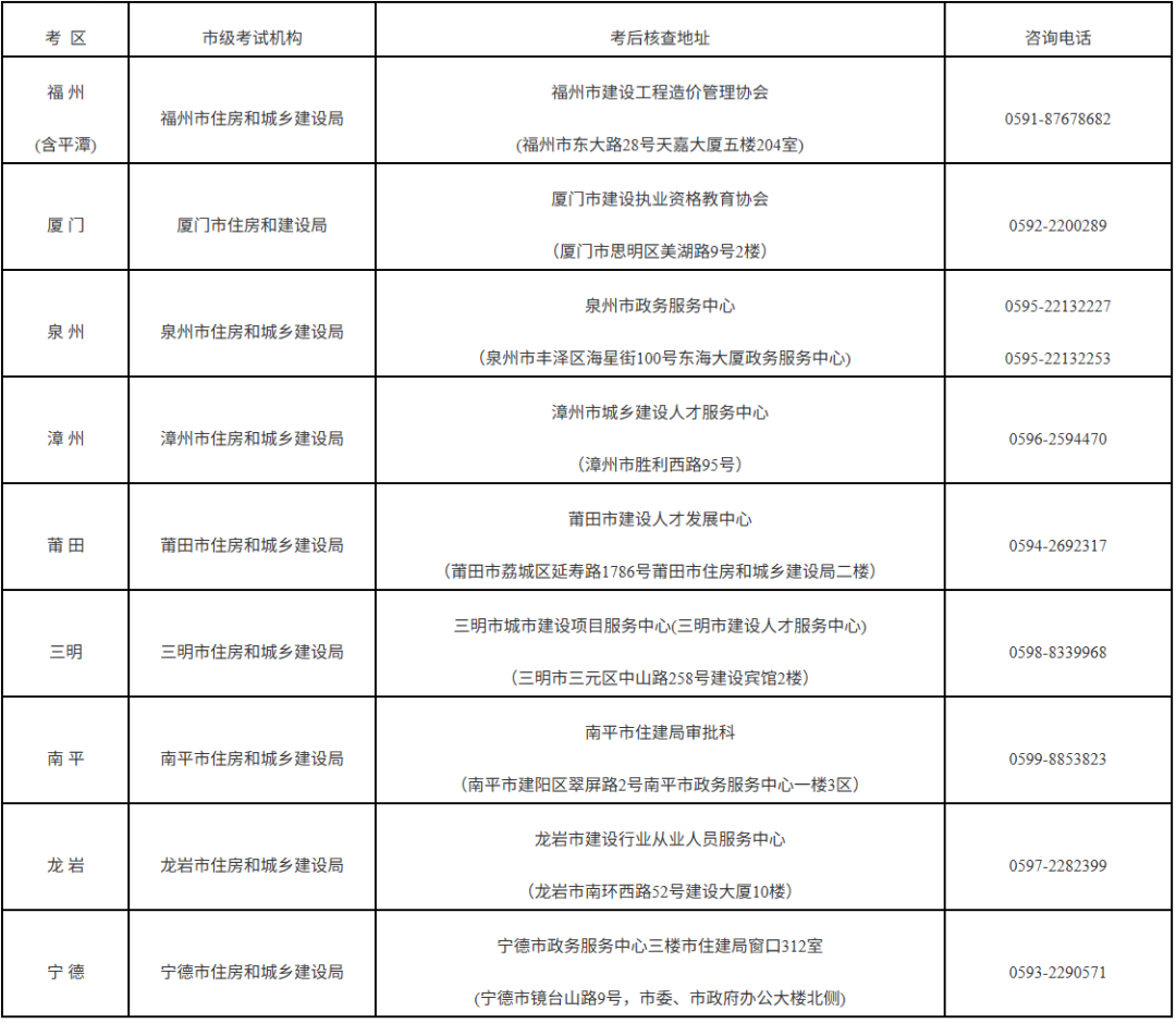 考后现场核查工作由省住房和城乡建设厅、人力资源和社会保障厅共同负责;各设区市住建局、人社局具体承担本地区考后资格核查工作。届时可登录“福建省住房和城乡建设厅(网站:http://zjt.fujian.gov.cn/)—行业管理—执业注册—资格考试”栏目查询,具体安排将另行通知。